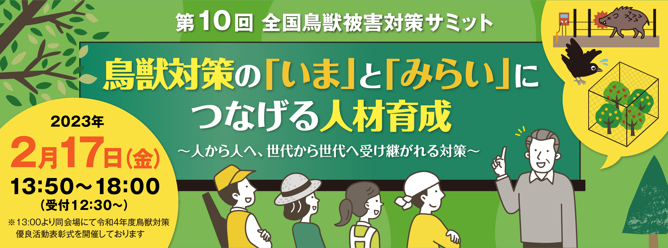 今年度のサミットは、≪鳥獣対策の「いま」と「みらい」につなげる人材育成 ~人から人へ、世代から世代へ受け継がれる対策~≫というテーマで開催します。 鳥獣対策の「いま」、そして「みらい」に繋げるをキーワードに、対策に係る幅広い分野での人材育成について、それぞれの視点でどのように具体的な活動をされているかを取組事例として紹介いたします。